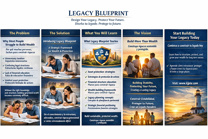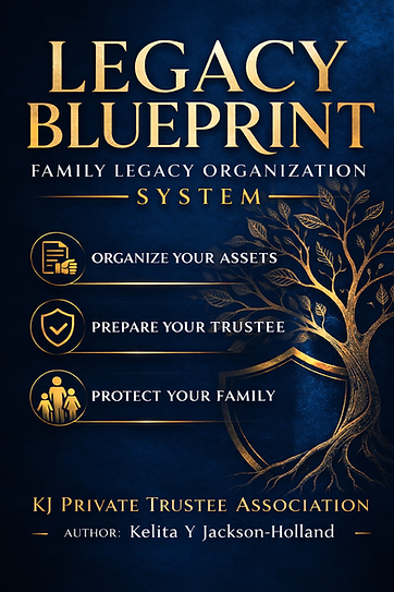 A Structured Approach to Family Legacy Preparation The Legacy Blueprint™ System is an educational and organizational program designed to help individuals and families prepare for the estate planning process by organizing important information, identifying responsible individuals, and creating clarity for future generations. Developed through the KJ Private Trustee Association, the Legacy Blueprint™ provides families with practical tools, guidance, and educational resources that help simplify the often confusing process of legacy planning. The program focuses on helping families organize the key elements of their legacy so loved ones are not left searching for information during difficult moments.